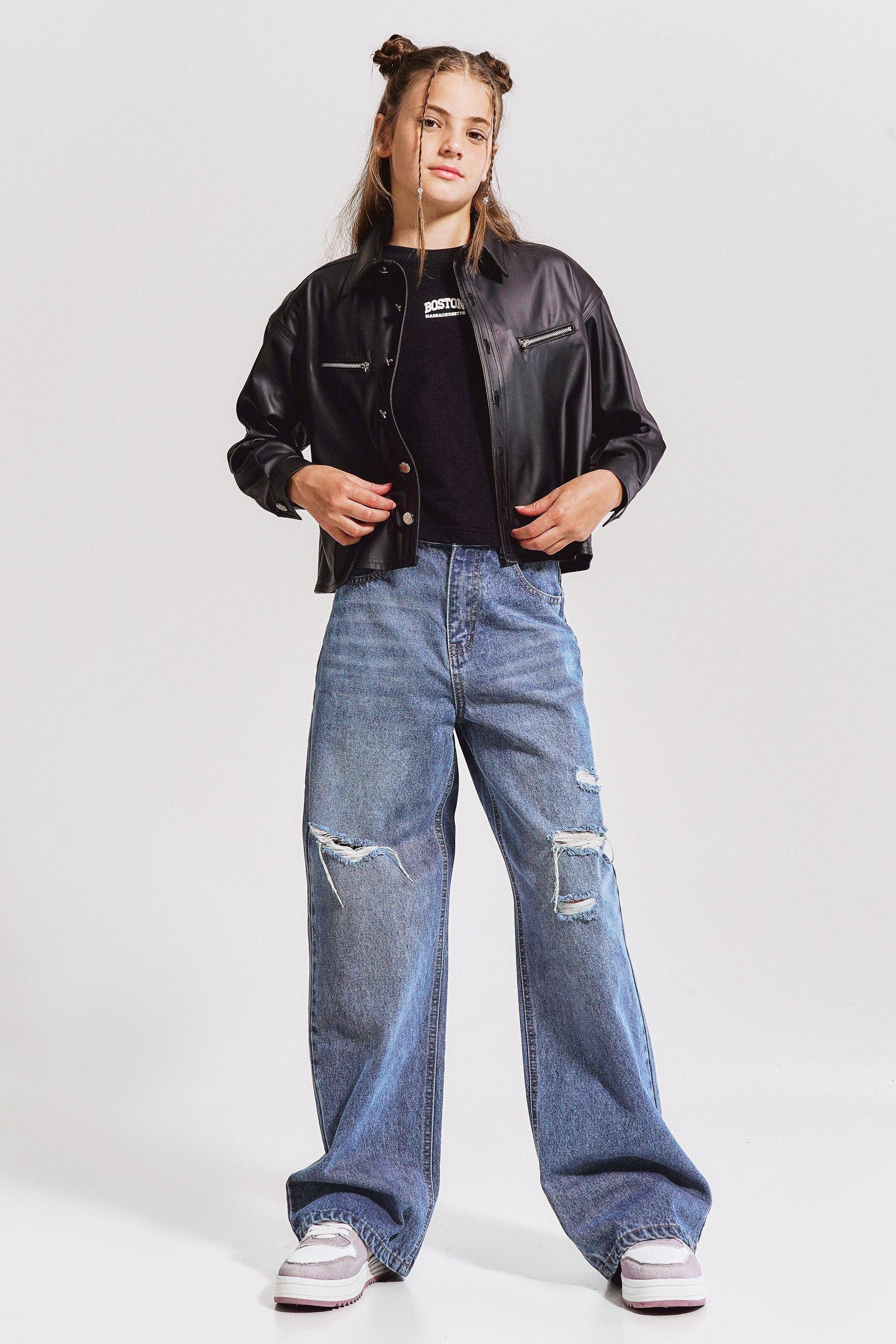 Has the girl got jeans?